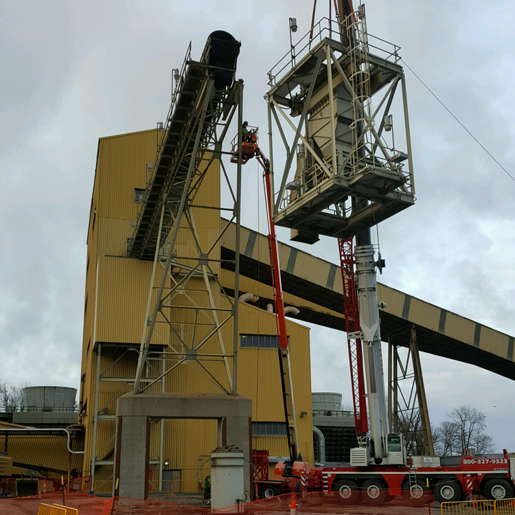 Helmkamp Construction Company was contracted by Tinuum Services, LLC to remove existing limestone equipment, install new equipment and perform structure modifications, etc. Helmkamp Construction subcontracted the removal of the existing limestone equipment to Hayden Wrecking. Hayden Wrecking lead exposure trained demolition craftsmen utilized a manlift, cutting torches and a hydraulic crane to dismantle the elevated limestone conveyors and support structure. Our craftsmen then utilized burning bars to cut up a stainless steel coal hopper. The salvageable material generated from the conveyors, structure and hopper were taken to a recycling firm.